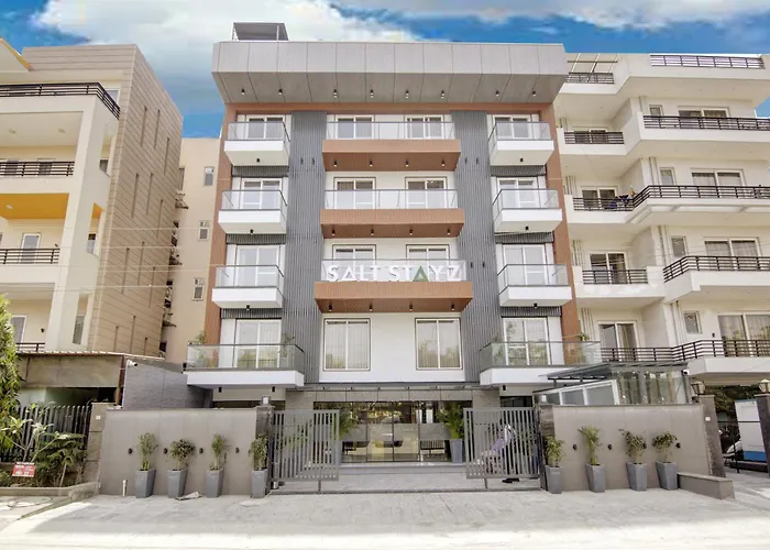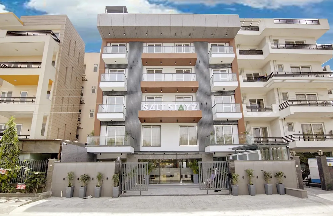 Saltstayz Premier - Near Golf Course Road & Sector 57 hotel offers rooms with a dressing room and a dining area featuring ironing facilities and climate control, along with a flat-screen TV with satellite channels. Furnished with a cupboard and a writing desk, they also have soundproof windows. Bathroom essentials include a bidet, a roll-in shower, and a separate toilet as well as bath sheets and bathrobes for guests' extra comfort.